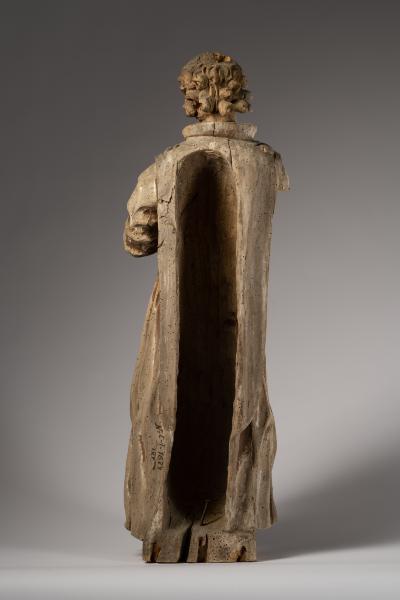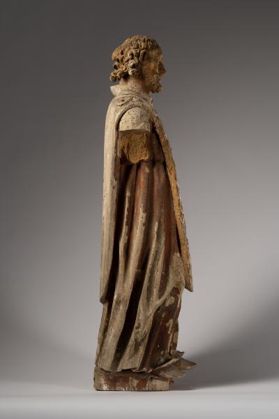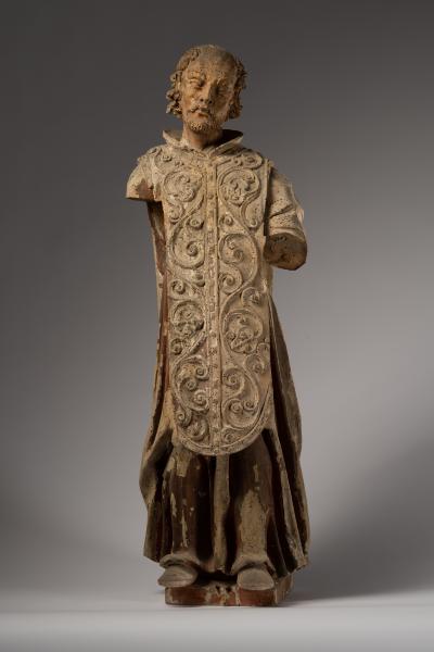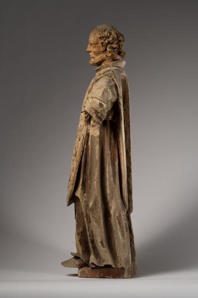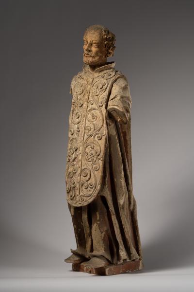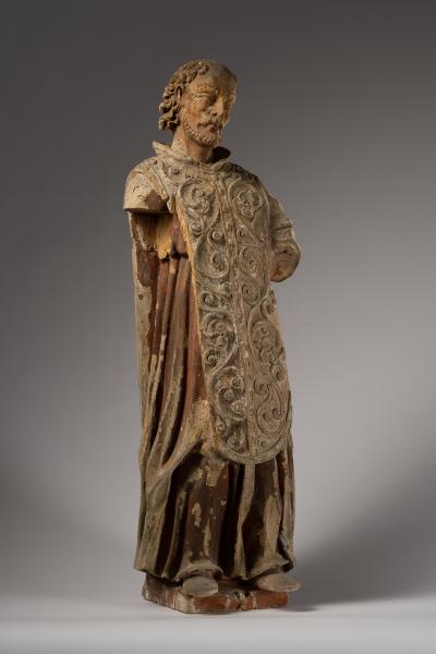 The full-bodied image of the saint is restrained in movement. He is dressed in a long dark tunic and a chasuble, the outer liturgical vestment of the Roman Catholic Church. The man's chasuble is cut and with smooth gold embroidery. Such "cut vestments" appeared in the Baroque period. The saint's vestments are modelled with straight vertical strands that fall freely downwards. The pattern of the garment's drapery is somewhat restrained and arranged without excessive folds and intersecting lines. The emotional tension is evident in the expression of the elongated face, framed by curls of wavy hair and a short beard, worked out with flat, ritualistic lines. Full of melancholic thoughts, the saint is depicted with barely drawn, low-set eyebrows, a high, smooth forehead, small eyes, and a slightly open mouth. The saint's confident gaze and emotional reserve create the image of a purposeful and self-confident person.