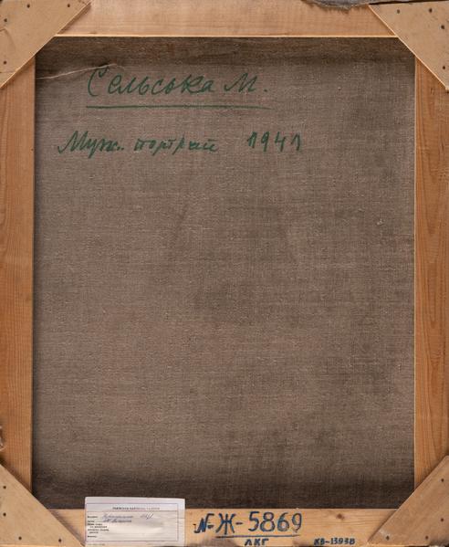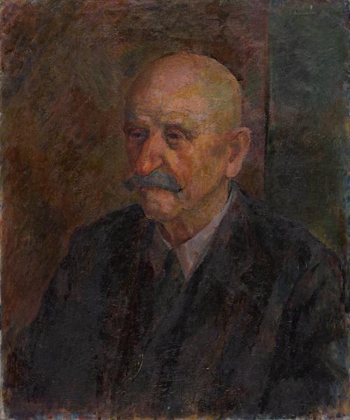 Against a brownish ochre background of the vertical composition is a bust image of an old bald man turned to the left. His face is elongated, with deep wrinkles on the forehead converging on the bridge of the nose. His gaze is weary, directed to the left. The man's nose is long, slightly thickened at the bottom. A greyish moustache covers his upper lip. He is wearing a jacket with a dark vest, a grey shirt and a dark green tie. The artist focused on the man's face since the light fell there. This adds a psychological dramatism to the portrait, emphasised by the tired but full of peace and wisdom look of the older man.