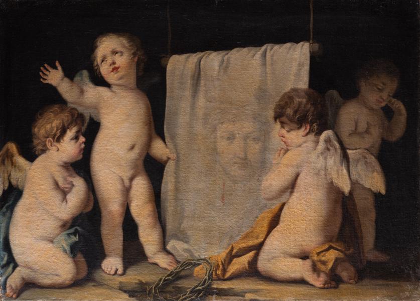 The legend of Veronica's veil inspired many artists of different eras to create similar paintings. According to the Blessed Anne Catherine Emmerich's revelations, the woman from Jerusalem who wiped Christ's suffering face was called Seraphia. When she saw Jesus carrying the cross to Golgotha, the woman felt pity for him and offered her veil to wipe the blood and sweat from his face. His face was imprinted on the veil, and Seraphia was given the name Veronica for her devotion, which is considered an anagram of the expression "true image" ("icona vera"). Later the relic became known as the "Veil of Saint Veronica". The Gallery received this work by Jacopo Amigoni along with the Baworowski Library's collection. The painting depicts a white cloth with the Lord's face and four angels in the form of children adoring the relic. Amigoni executed the work in the Rococo style masterfully and theatrically. The artist paid great attention to details.