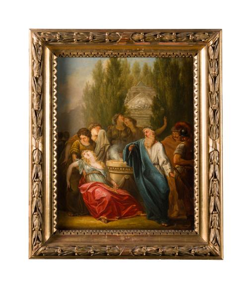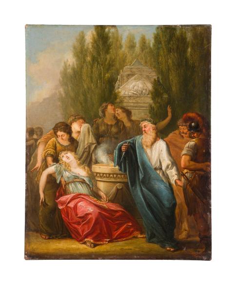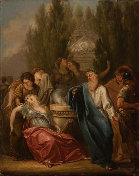 In Greek mythology, Polyxena was the daughter of Priam and Hecuba. Achilles accidentally saw the girl and fell in love with her. He decided to marry her and head to Troy but was treacherously killed by Paris just as he arrived, unarmed, to marry Polyxena. According to another version, Achilles sent Automedon to request her hand in marriage from Hector. Hector declared that Polyxena would marry Achilles on the day he betrayed his countrymen. Since Achilles could not betray his people, he couldn't marry Polyxena, which caused him immense suffering. When Hermes convinced Achilles to accept a ransom for Hector's body, there was not enough gold left in Priam's treasury. Polyxena, watching from the wall, threw her bracelets down to make up for the missing weight. This act once again captivated Achilles, who offered Priam to keep the gold for himself but give Polyxena to him in return. The King of Troy responded that he would give his daughter to Achilles if he convinced the Greeks to lift the siege and sail home. Thus, Achilles became a victim of a plot. Polyxena learned that Achilles's heel was his weak spot. He came to the temple of Apollo unarmed and barefoot at her request. Deiphobus pressed Achilles against his chest, and Paris struck him in the heel with a poisoned arrow. When the Achaeans were about to return home after the fall of Troy, Achilles's shadow appeared above his cenotaph and demanded that Polyxena be sacrificed to him. Otherwise, the sails of the Greek ships would never be filled with wind. Neoptolemus, the son of Achilles, offered Polyxena as a sacrifice. She proudly presented herself for the sword strike and died with dignity. The tale of Polyxena, documented in the Cyclic epic, lyrics, and Athenian tragedy, refers to the ancient custom of burying the hero's wife, concubines, favourite servants, and horse with him. In a later version, her demise was romantically explained: the enamoured Achilles was killed when he came unarmed to negotiate their wedding, and after his death, he took his betrothed with him. Schutz's painting depicts a group of people around an altar against the backdrop of a green grove with a tomb. To the right of the altar is Polyxena. In the background to the right is the tomb of Achilles, with the image of a helmet crowned with a laurel wreath. Neoptolemus is in the foreground to the right of the altar, accompanied by Achaean warriors.