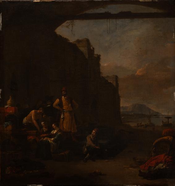 The painting depicts a fortress with a group of people in front of it. In the background is a dock with a sailboat and people carrying cargo. In the distance, mountains and clouds can be seen against a blue sky. The artist meticulously portrayed the landscape and characters, giving them emotional depth. Wijck depicted the contrast between the architectural and natural landscape through subtle lighting effects and incorporated enigmatic forms in architecture and hills, against which he placed this genre scene.