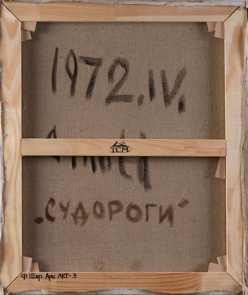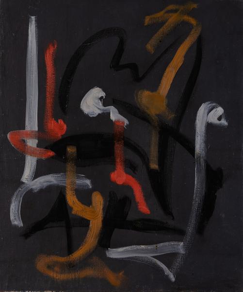 The vertical rectangular canvas with an achromatic background depicts a series of coloured stripes (white, black, ochre, and red), which are brush marks left by the author's specific hand movement. Such an approach is somewhat in line with automatic writing practices. This idea is suggested by interpreting lines comparable to specific forms of non-Cyrillic calligraphy. Through artistic means, the author explored his corporeality and psyche, particularly the unconscious. The colour scheme used by the artist also refers to primitive art forms that used natural pigments: charcoal (black), ochre (red and yellow), and chalk (white). Given Arnold Sharhorodskyi's well-known reflections on the sacred texts of various religions, the works of Sigmund Freud and his followers, and his study of various periods of art history, including primitive art, it is reasonable to assume that this painting is the result of a personal reflection on this mass of information. For example, it involves studying oneself and correlating the "self" with collective unconscious archetypes, where artistic practice becomes a meditative or ecstatic experience. Given the prevalence of consonant precedents in art of the time, we can observe a young artist testing different ideas and forms to find what would later become the defining feature of his anthropological practice.