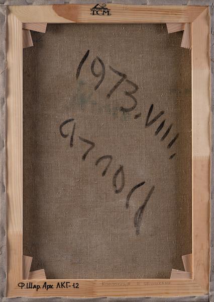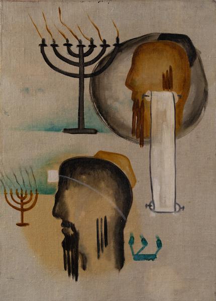 Against a white background, two menorahs with all the candles lit and two stylised profiles of bearded men in kippahs are pictured. The menorahs and profiles are paired: one pair is depicted in the upper part of the work, the other – in the lower part. Next to the upper figure is an unfolded white scroll on a wooden roll (Atzei Chaim) with handles on both sides. However, this parchment (paper?) has no writing, making determining the author's meaning difficult. In the lower right corner is the letter ש, which can be seen on mezuzahs (the first letter in one of God's names), on dreidels (representing a fine in the game), and also holds a series of meanings in Kabbalah. According to the artist, this work belongs to his "Kabbalistic things", which, however, are more an attempt to tell the story of his family and origins than a manifestation of religious self-identification. In his interviews, the author noted his non-denominationalism and acknowledged the equality of all Abrahamic religions in matters of God's knowledge and communion.