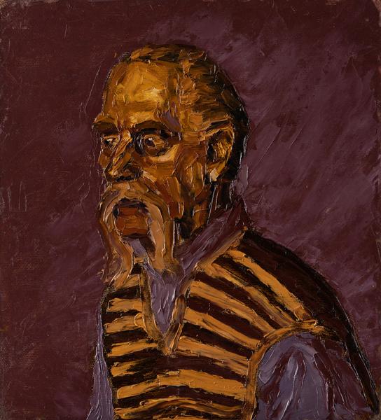 On the artwork's front side, against a plain purple background, is a half-figure portrait of an older man (model?) with a long grey moustache in a three-quarter view. He wears a striped brown and yellow sleeveless vest and a purple shirt. This image likely results from completing an educational task involving studying live models. On the reverse is an interpretation of gymnastic equipment against a red parquet.
