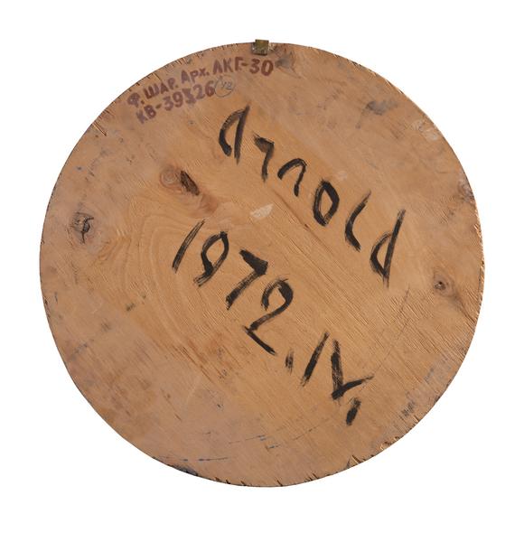 A stylised modernist portrait of a woman with the inscription "LA BELLA" is set in a classical tondo similar to the Italian coppe amatorie. In the manner of the 16th-century masters of Castel Durante (Urbino), who placed the figure in a light perspective on a plain background, Arnold Sharhorodskyi presents an image of "new beauty" on a homogeneous green background. At the time of the creation of this work, this Renaissance practice was well-known among ceramists, graduates of the Lviv State Institute of Applied and Decorative Arts, and employees of the Lviv Ceramic and Sculpture Factory. In particular, the young students of the Artistic Ceramics Department of the Lviv State Institute of Applied and Decorative Arts were creating author's portrait plates of this type. The list of required reading included Alfred Kube's book "History of Faience" (RSFSR, State Publishing House, Berlin, 1923), which contains a separate section on "Italian Maiolica". Moreover, since the 1970s, the ceramics of the above-mentioned centre have been represented in the collection of the State Museum of Ethnography and Arts and Crafts of the Academy of Sciences of the USSR (e.g. in the 1976 catalogue). Therefore, the artist, who interacted with various representatives of the Lviv community, had the opportunity to become acquainted with this experience and rethink it in practice. The work's title and the figure's angle could be a reference to Titian Vecellio's work of the same name, dated 1536. The formal stylistic approach proposed by the artist is the result of his familiarity with the theoretical and visual developments of Pablo Picasso and local avant-garde artists (similar decorative solutions are found in the works of Borys Kosarev, who, in addition to Kharkiv, for a short period (1947–1948) taught at the London School of Art and Design). The composition is holistic and balanced, with tonal and colour accents. The parts of the body and the contours, reduced to geometric shapes, are recognisable and reproduce a delicate harmony.
