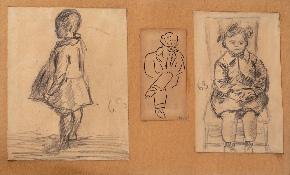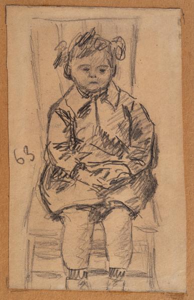 A pencil drawing on paper shows a lifelike portrait of a girl (probably 3–3.5 years old) sitting in a chair with a wooden back and padded seat. The child is wearing a dress with a turn-down collar, her medium-length hair is tied in two "ponytails" with two narrow satin (?) ribbons, and she is wearing short socks with a corrugated top. The expression on the girl's face suggests that she had been posing for some time and was tired. This type of life model drawing was quite common, both in the sense of preparation and during the actual artistic training. For example, Kuzma Petrov-Vodkin (1878–1939) made consonant drawings of children and young men (Ф.Шар.Арх.ЛКГ-48) at various stages of his artistic training (a drawing of a child with a teddy bear in 1926, ink illustrations in 1932, or life drawings in 1937). The theme of posing children is reflected quite thoroughly in the well-known diaries and notes of the avant-garde artist Alisa Poret (1902–1984), a student of Kuzma Petrov-Vodkin, who worked for a long time (from 1920 to the 1980s) on the design of children's books and magazines.
