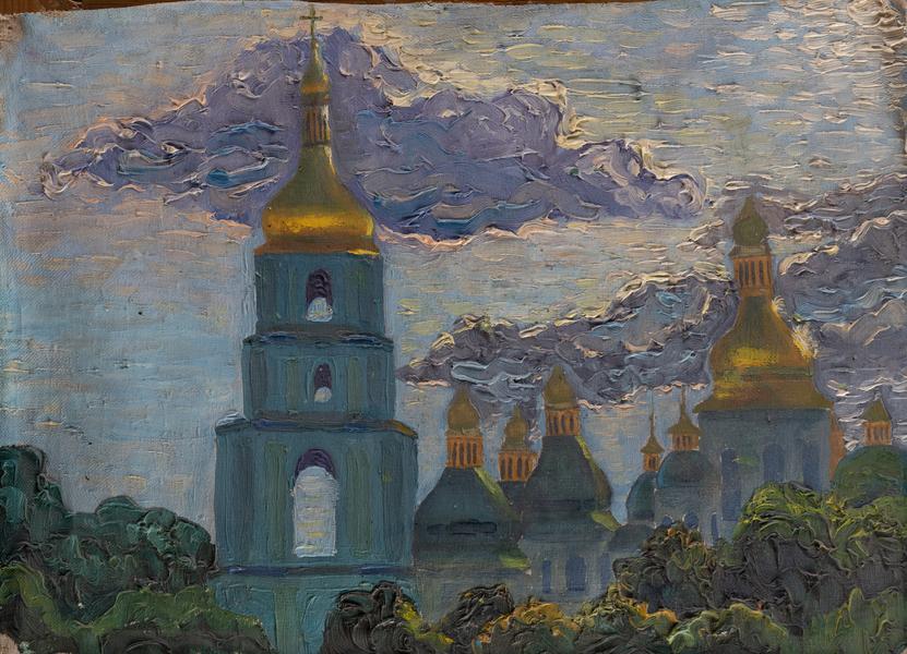 The work depicts the Kyiv Saint Sofia Cathedral with the bell tower, seen from the direction of Saint Sofia Square. The sketch was made in daylight, probably in autumn (there is a characteristic change in the colour of the leaves of the trees in the foreground on the right). The architecture is correctly executed from the point of view of plein air painting, especially the perspective. The artist has tried to add impressionistic touches to the style, but in general, the picture is realistic. The colours are mixed, and there are tonal and chromatic accents.