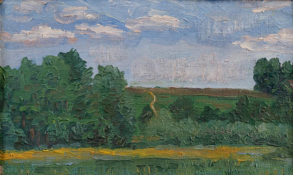 The work depicts a sunny summer landscape. This is a rectangular realistic life study. The colour palette is mixed, and there are tonal and temperature accents. The manner of performance involves a combination of impressionistic connotations with motifs characteristic of Central European realistic painting of the second half of the nineteenth century. The landscape reflects the countryside with unpaved roads typical of the rural area. In the foreground, there is probably a marshy meadow with low yellow flowers (taking into account the season, location and region, this is Ranunculus bulbosus – bulbous buttercup). Against the background of this meadow are shrub-like groups of trees and bushes, which often grow near small streams and reclamation canals. Since a plain with fields is depicted in the background, we can assume that this is rather a canal because, in the 1960s, hydromelioration and agroforestry took place on the territory of the USSR.