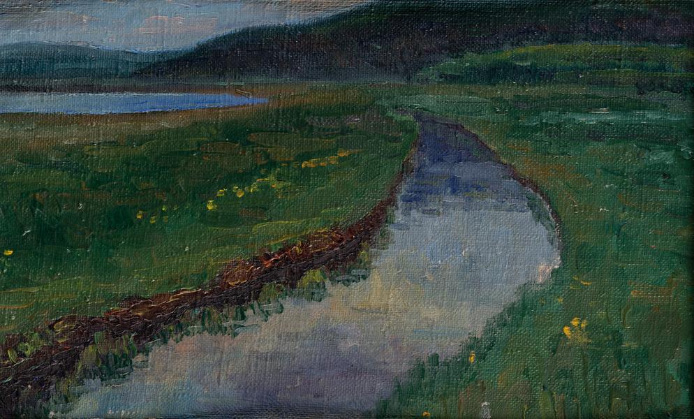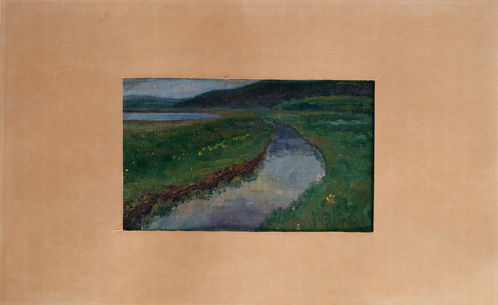The horizontal work depicts a hilly landscape with a river and a small lake among spreading meadows. In this work, the author conveyed the elegiac twilight atmosphere of a summer evening. The colour palette is cold; shades of green, blue, and purple prevail. There are separate tonal accents; the composition is asymmetrical and harmonious. The author correctly combined generalised and stylised planes with detailed fragments, contributing to visual expressiveness. In general, the manner of performance and approach to stylisation are similar to the sketch Ф.Шар.Арх.ЛКГ-61.
