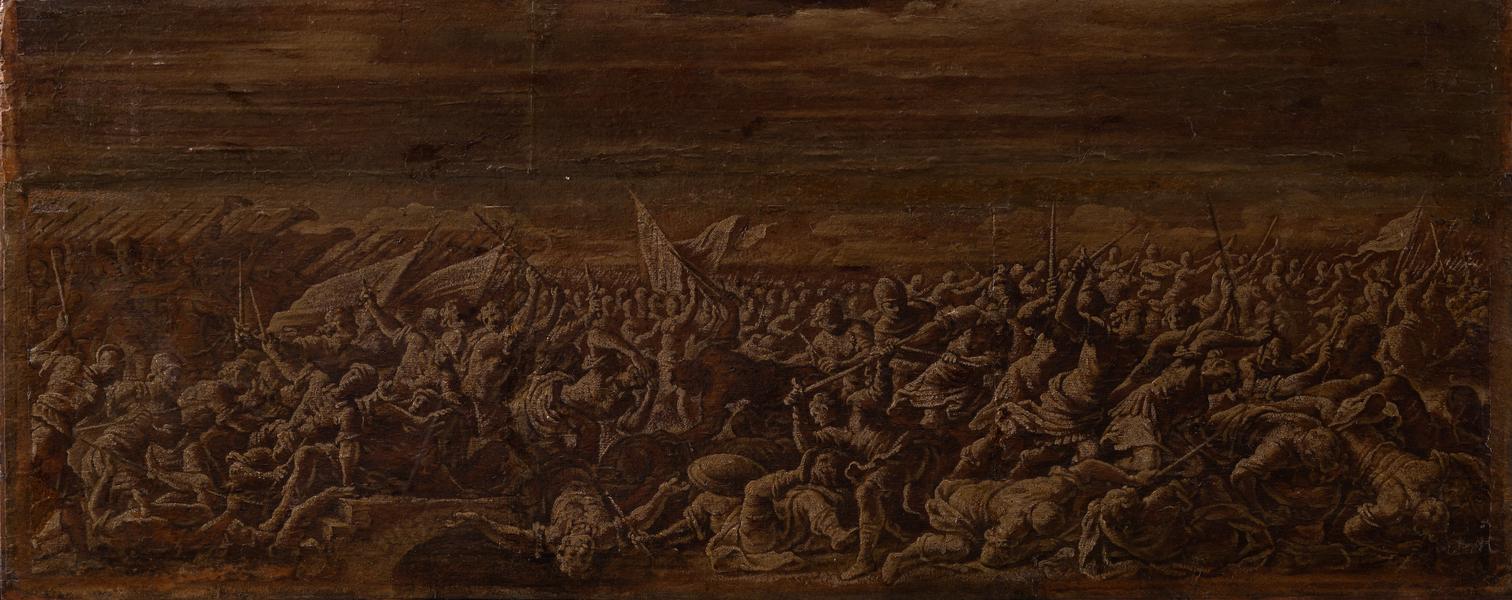 The painting "Battle Between Romans and Barbarians" was initially attributed to an unknown artist when the Gallery received it. Later, it was attributed to Polidoro da Caravaggio. However, the authorship was eventually established to be that of Marco Antonio Bassetti based on analogies in his Royal Collection of Windsor sketches. Such monochrome compositions on ancient history and mythology themes, executed in oil on paper, were not merely preparatory sketches – contemporaries interpreted them as independent works. Bassetti primarily painted such pictures during the winter, and they were popular among foreigners travelling to Verona. The "Battle Between Romans and Barbarians" artwork was created using the grisaille technique, common in the late sixteenth-century Venetian School. The painting depicts a large group of warriors during the battle. The foreground portrays duels, while the centre showcases four camps. In the background, there are warriors with spears. Using colour and shading creates an effect of relief painting in an ancient style.