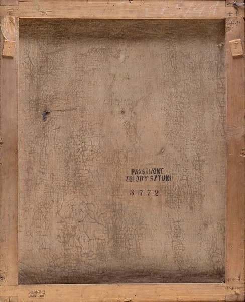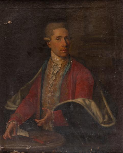 The painting depicts a man standing at a round table, turned three-quarters, looking at the viewer. The portrait's hairstyle corresponds to late eighteenth-century fashion. He wears a red velvet caftan, a blue waistcoat embroidered with gold silk, and a jabot. The sleeves are adorned with lace, and he wears a white scarf around his neck. A black cloak with a white sable fur lining is pulled down from his shoulders and draped over his left arm. The diplomat raises his left hand while holding an open book with his right hand. The frame of the book partially overlays the inscription: "Titutiones Politiques Paris 1776".