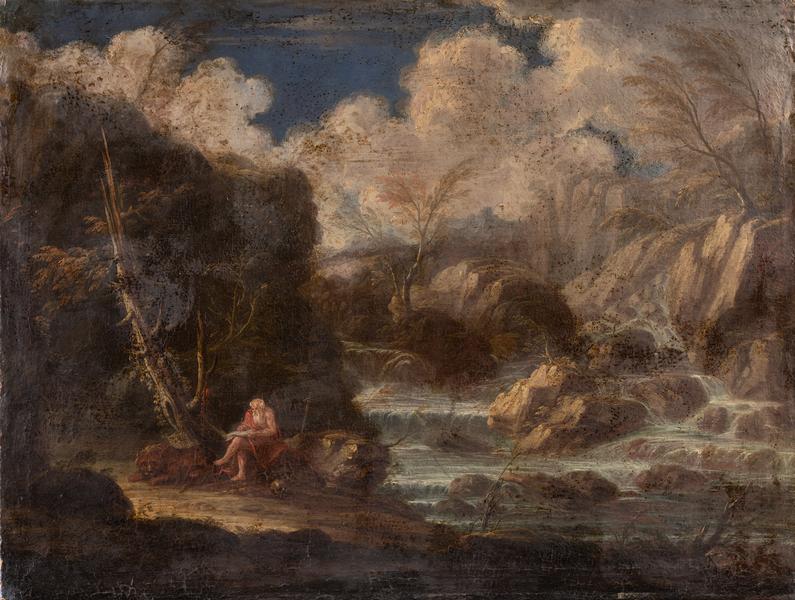 Saint Jerome (c. 342–420 AD) was a theologian, writer, and hermit known for the first Latin translation of the Bible, the Vulgate. After the Council of Trent declared the Vulgate as the official translation of the Bible, Saint Jerome became a popular figure in 17th and 18th-century art. Jerome spent four years in the desert, and as a result, in many images, the artists paid considerable attention to the mountainous landscape details. Most commonly, the saint was depicted as a penitent with a cloth around his hips, appearing gaunt and weary. He was often portrayed almost nude, even if the work featured him writing a book, as this was the typical representation of penitent hermits. The painting’s author presented the saint in a comfortable pose with a book on his knees amidst a beautiful landscape with a river, evoking contemplation and mindful reverence.
