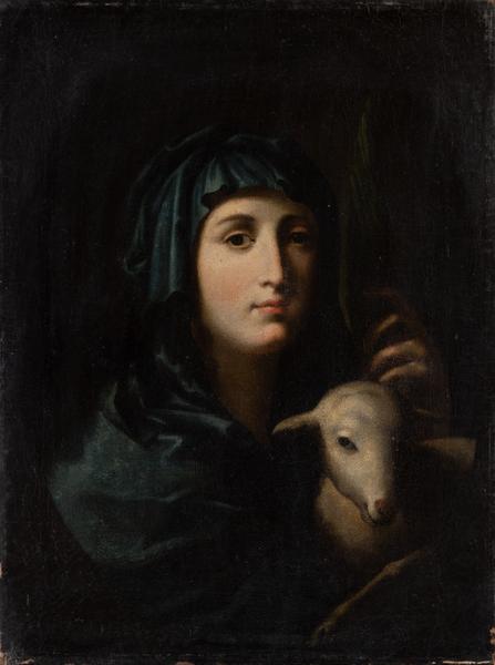 The painting portrays a young woman looking confidently at the viewer. She is depicted as Agnes, the patron saint of young girls and maidens, with her characteristic attributes: a lamb (a symbol of her virtuous innocence and Christian devotion) and a palm branch. Her name means "chaste" in Greek, but it is also associated with a lamb – the saint was betrothed to Christ, the Lamb of God. That is why Agnes is depicted with a lamb. The iconography of Saint Agnes also presents her with two crowns, symbolising chastity and martyrdom. In addition, her attributes included ivory, an oil lamp, a lily, a sword, and a scroll. There is limited reliable historical information about the life and martyrdom of Agnes of Rome. However, it is known that she died by the sword during the reign of Diocletian. Saint Ambrose and Saint Jerome, Saint Pope Damasus, Saint Gregory the Great, and many others mentioned her pure and courageous faith testimony. According to tradition, Agnes was about to be married to a wealthy Roman young man, but she refused, saying that she had found a husband whom earthly eyes could not see. To intimidate Agnes, the suitor for her hand in marriage revealed that she was a Christian. The saint was condemned to death and was about to be burned at the stake. This attempt failed, and she was eventually beheaded.