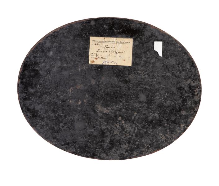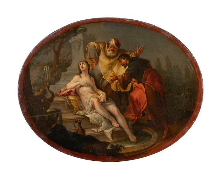In the oval, the painting depicts a young woman sitting on the steps of a font, trying to cover her nudity with her hand, while two bearded men look at her mockingly and try to reach her. The young woman is Susanna, a beautiful and virtuous character of the Old Testament. According to the apocryphal additions to the Book of Daniel, Susanna was bathing in a garden on a hot day. When the elders saw her, they threatened to accuse her of adultery, a crime punishable by death if she refused to submit to their desires. She was a virtuous wife and rejected the advances of the men, who then carried out their threat. Later, she was accused of adultery, but her innocence was proven when her accusers were subjected to cross-examination and caught in a lie. This theme was popular among commissioners, as it offered a justification for depicting a partially clothed female figure that could be openly admired.