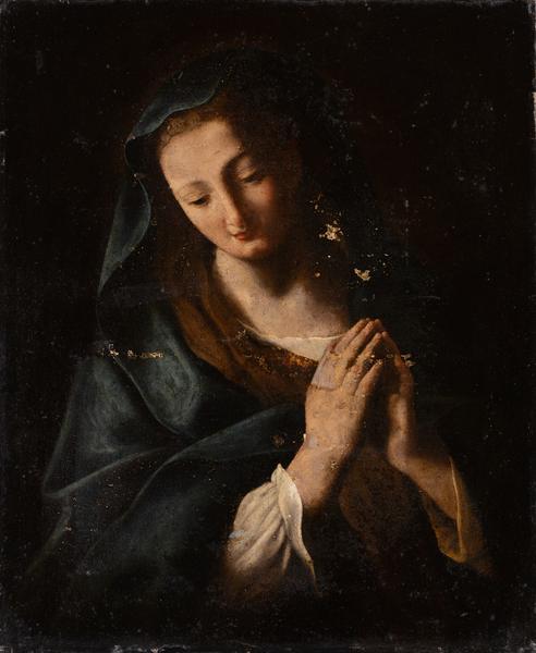 The painting depicts a saint with her head tilted to the left, facing the viewer. The woman's eyes look down, and her hands are clasped in prayer. She is dressed in a white shirt, a brown low-cut dress, and a green drape hanging from her head and covering her body. Her name, "Mary", is of Hebrew origin. It was quite common and was mentioned several times in the New Testament. The name "Magdalene" is considered geographical and traditionally means "from the town of Magdala". For centuries, Mary Magdalene was considered the same person as Mary, the sister of Lazarus and Martha. This interpretation comes from Gregory the Great. Mary Magdalene remained faithful to Christ in moments of glory and during his greatest humiliation in Golgotha. At Jesus' trial, she heard Pontius Pilate pronounce the death sentence and witnessed the crowd beating and mocking him. During the crucifixion, Mary stood by the Cross alongside the Virgin Mary, supporting Jesus, experiencing the Savior's suffering, and sharing in the immense sorrow of the Mother of God.