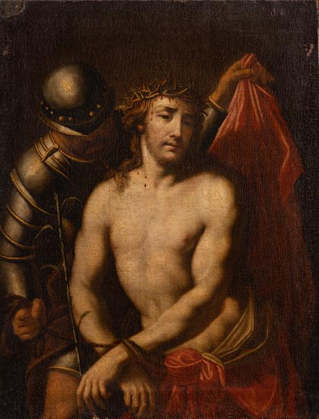 Ecce Homo – "Behold the Man" or "This is the man", were the words Pontius Pilate spoke about Jesus Christ. According to the Gospel of John, the procurator of Judea, Pontius Pilate, presented Jesus Christ to the people of Jerusalem after he had been scourged, in an attempt to evoke sympathy from the crowd. Jesus is clothed in a red robe with a crown of thorns on his head. Many artists depicted this scene in their works. On the canvas, the figure of the suffering Saviour, naked to the waist, is accentuated by light. Jesus' muscular torso is contrasted with a red robe covering the lower part of his body. His head, crowned with thorns, is turned three-quarters to the right. Drops of blood are on his face, and his gaze is directed downward. Jesus' hands are bound with a rope, and his left hand holds a stalk. The soldier, wearing armour, holds the rope that binds Jesus with his right hand and a part of the red cloak with his left hand. The viewer cannot see the face of the soldier – it is not significant.