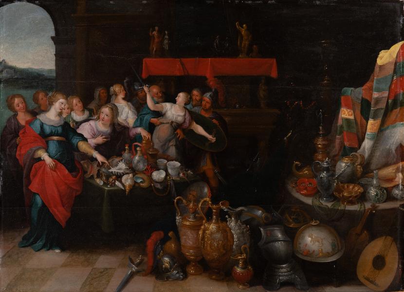 The canvas illustrates the mythological story of Achilles among the daughters of Lycomedes. Achilles was the son of the Myrmidons' king Peleus and Thetis, a sea goddess. To save Achilles from death near Troy, Thetis disguised him as a girl and left him under the care of King Lycomedes of Scyros. In his palace, Achilles lived under the name Cercysera, Aissa or Pyrrha. Achilles had a relationship with Lycomedes' daughter Deidamia, who gave birth to their son Pyrrhus, later known as Neoptolemus. Another version states that Neoptolemus was the son of Achilles and Iphigenia. Having learnt of Achilles' hiding place, Odysseus, Nestor, and Ajax were sent to take him from Scyros. Lycomedes allowed them to search the entire palace, thinking he had hidden Achilles well. However, Odysseus devised a cunning plan – he laid out gifts for the women and put a sword and shield between them. Achilles took the weapons and promised to lead the Myrmidons to Troy. The painting depicts a multi-figured scene inside a building. On the left, a group of young girls in colourful dresses is portrayed near a table with exquisite dishes, seashells, corals, and pearls. A girl with a sword and shield is shown on the far right. She has turned her head towards a man standing behind her, holding her by the waist. Behind her are the figures of four other men, two wearing helmets. Exquisite dishes, weapons, musical instruments, and colourful fabrics are displayed on the ground in the centre and on an oval table to the right. To the left, a seascape with hills opens through an archway.