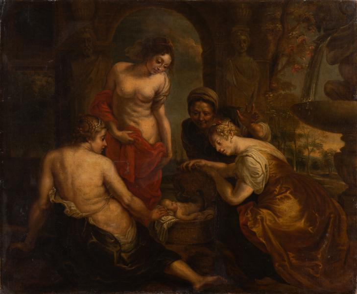 Erichthonius is a character from ancient Greek mythology, mentioned in the "Iliad" and the "Odyssey" as Erechtheus. Erichthonius was a king of Athens, born to the goddess of the Earth, Gaia, and the god of blacksmiths and craftsmen, Hephaestus. Athena concealed the infant Erichthonius in a chest and entrusted it to the care of the daughters of Cecrops – Herse, Aglaurus, and Pandrosus. Athena strictly forbade the girls from looking inside the chest because Erichthonius had a serpent-like body. However, the princesses disobeyed her and opened the chest. Aglaurus and Herse were struck with madness upon seeing Erichthonius and threw themselves from the Acropolis cliffs. Therefore, Athena raised Erichthonius in her temple. Erichthonius is often depicted as a snake-like figure alongside Athena in art and mythology. Such a scene can also be found in the works of Flemish artists Peter Paul Rubens ("The Discovery of the Infant Erichthonius") and Jacob Jordaens ("Erichthonius Discovered by the Daughters of Cecrops"). There is a version that this painting may belong to another Flemish artist, Theodoor van Thulden (1606–1669). Van Thulden created altarpieces, mythological subjects, allegorical works, and portraits. Initially, his style was influenced by the Mannerism of the Fontainebleau School, but later, he was influenced by Peter Paul Rubens, with whom he frequently collaborated. The artist played an important intermediary role, introducing aspects of Flemish Baroque painting into the Dutch Republic. Gradually, van Thulden's works became more elegant, and he evolved towards a certain Classicism.