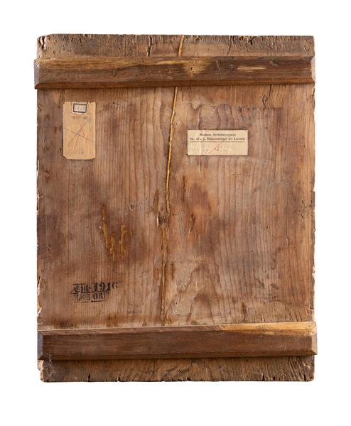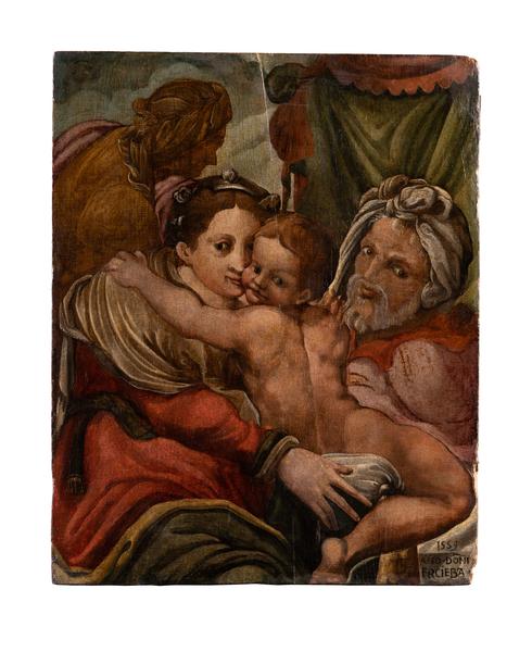 In the complex composition of the painting, the artist successfully emphasised the vitality of the figures in the classical "Holy Family" theme. On this canvas, the figures almost fill the entire painting surface. The infant's head is in the composition's centre, and the artist presents its body in a complex turn. The author combines the three figures of the Virgin Mary, Christ, and Joseph into a casual but inextricably connected group. They gaze attentively at the viewer with barely visible smiles on their faces. In the background, behind the central figures, is the figure of an older woman in profile with her head covered. The author does not show her face. Perhaps she represents Saint Anne. The painting's background is divided into two parts. In the upper right corner is an image of a tent in shades that resemble the Virgin Mary's clothing, which balances the composition of the canvas in a certain way. In the upper left corner is a depiction of a cloudy dark sky, possibly symbolising the hard fate of Christ.