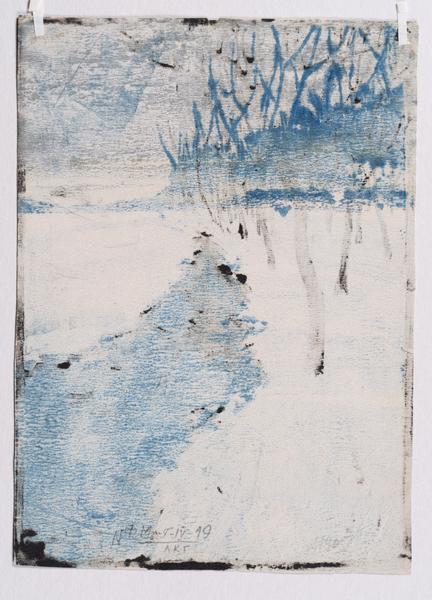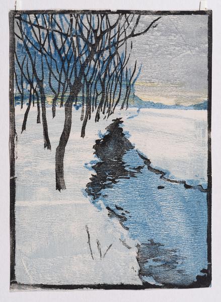 The engraving depicts a forest covered with snow against a cloudy sky and a stream of water unseen in the distance.