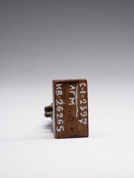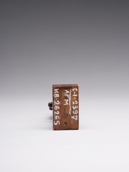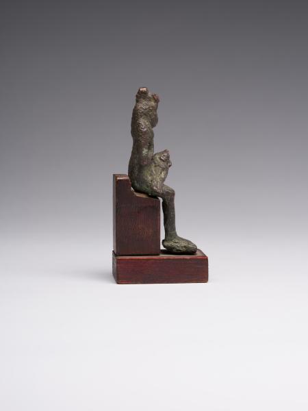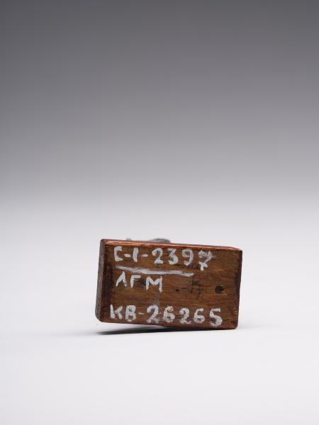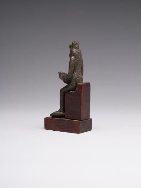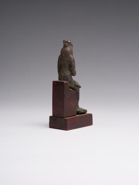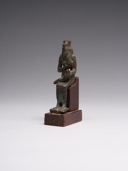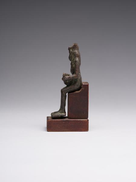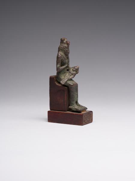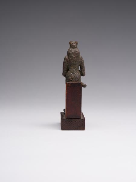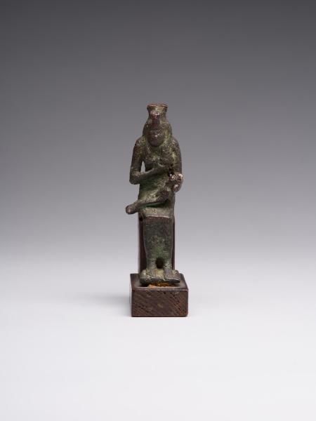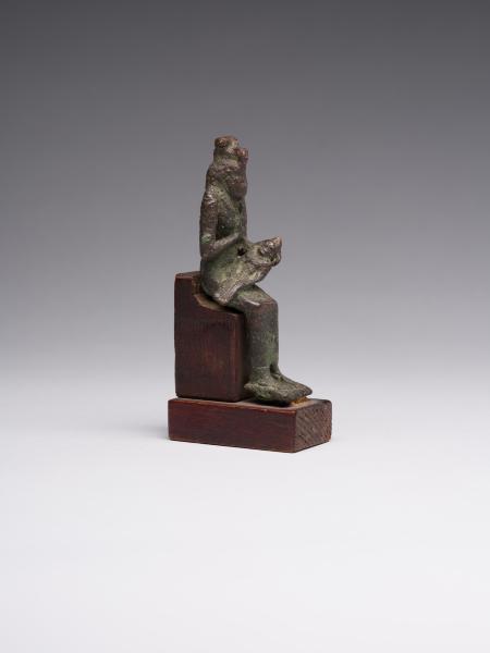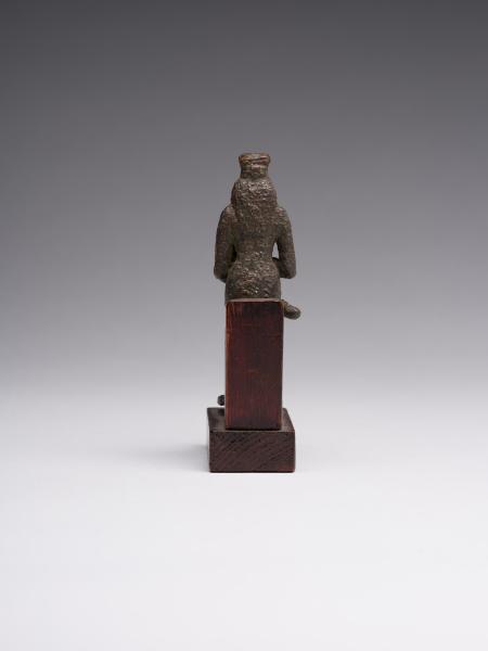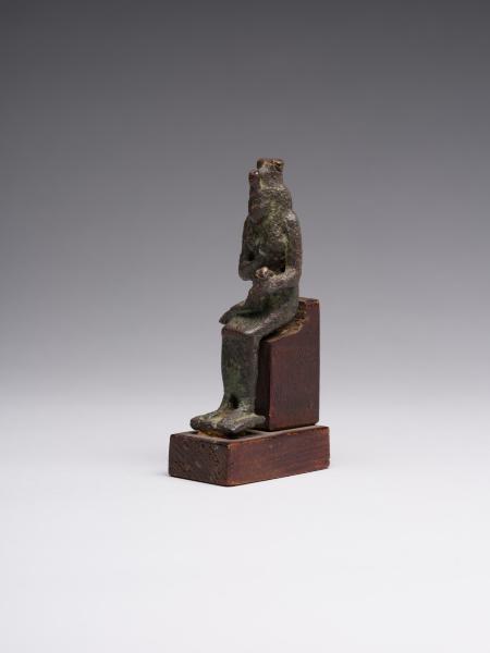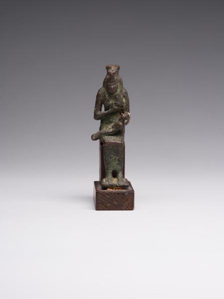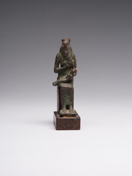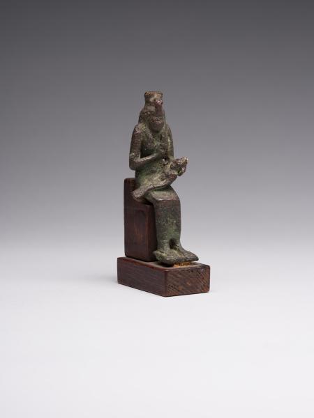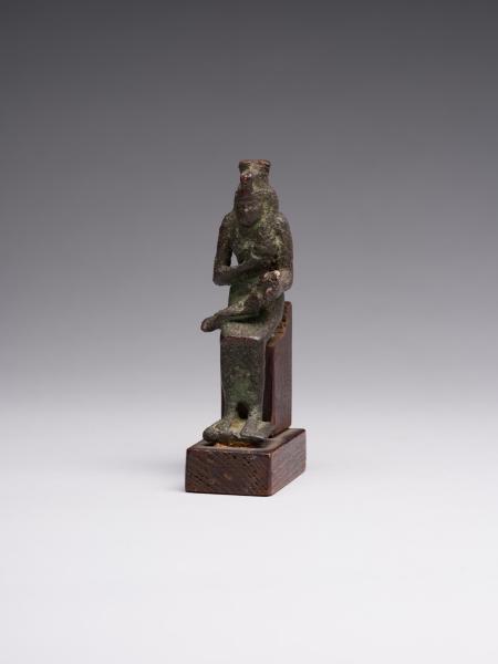 The figure is depicted sitting; a head and chest are full-faced. The clothing is in the form of a long, tight-fitting dress. On Isis's forehead is a uraeus, and on the top is a crown made of uraei (horns with a disk corresponding to the attributes of the figurine are missing). The hair is performed in the form of a lush wig made of thin braids, which is divided into three parts as follows: one part of the hair is falling on the back, the other two, fixed at the ends, are falling on the chest, while the ears remain open. A child is depicted without clothes; his head is hairless, except for the "sidelock of youth" falling from the left temple. The forearm of Isis's left hand is lowered alongside the chest, with the head of Horus resting on the palm; the right-hand palm supports the breast on the left side. The feet are resting on a stand, which constitutes a single unit with the figurine. Isis is sitting on the throne. Its basis is a rectangular wooden stand.
