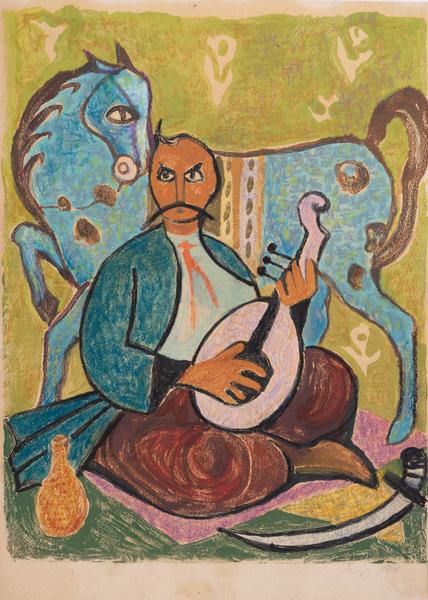 The image depicts a colour print on the entire plane of the sheet. The Cossack with a long moustache and a forelock (oseledets – a traditional Ukrainian men's hairstyle with a long strand of hair on a shaved head) is depicted. He sits dressed in a blue garment (svyta) and red-ocher trousers, with a pink rug underneath. The Cossack holds a kobza in his hands. To the left in front of him is a sabre, and to the right is a bottle. Behind him is a blue horse with an ocher mane, tail and spots on the body; its head is turned towards the Cossack. The background of the picture is yellow-green with decorative light spots.