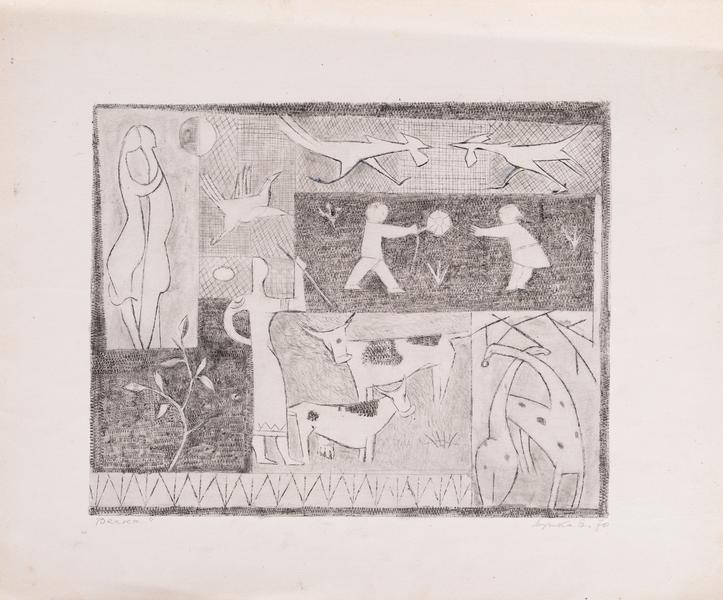 The image depicts a black-and-white print in the centre of the sheet. The image field is relatively divided into rectangles of different sizes and colours. Some plots and stylised images go beyond the rectangle. At the top left are figures of a man and a woman embracing. To the right are two flying birds; the moon is shown above them. At the top right are mirror images of roosters. Below them are two children playing with a ball. A twig with leaves is reproduced at the bottom left of the picture. A female figure, a cow and a bull follow it. At the bottom right are two deer leaning towards each other.