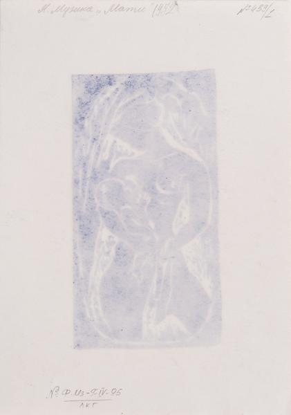 At the right below the pencil imprint is an inscription: "Muz". On the reverse side at the top is an inscription in pencil: "Y. Muzyka. ‘Mother’ 1972, No. 439/1".