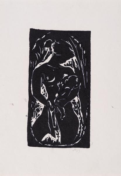 The image depicts a black-and-white print in the centre of the sheet. It portrays a naked woman with a baby in her arms near the chest. Her head is bowed to the right towards the child. Behind her are the outlines of trees. The contours of the images are white.