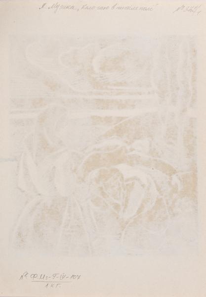 On the back at the top left is written in pencil: "325", at the right: "No. 372/2". In the centre: "Y. Muzyka ‘In the Open Field near the Grove’, lino / 21.6 x 18.7; 37.6 x 30".