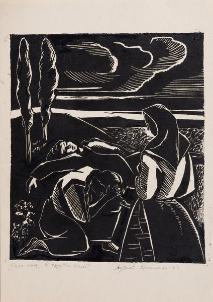 Yaroslava Muzyka (Stefanovych) was born in Zaliztsi in Ternopil region on January 10, 1894. She died on November 24, 1973, in Lviv. She was an artist of diverse preferences and talent. She turned to graphic art – linocuts, woodcuts, drypoint, monotype; painting – oil, tempera, gouache, encaustic; mosaic and enamel, on glass, grattage on gold or silver foil, batik, embossing on leather, embossing on metal. She studied drawing and painting at Leonard Podhorodecki Free Academy of Fine Arts in Lviv and André Lhote Academy in Paris. In 1928, she trained as an art restorer at the Central State Restoration Workshop of Ihor Grabar in Moscow. She also worked at the National Museum in the restoration workshop. Yaroslava Muzyka was one of the founders of the Association of Independent Ukrainian Artists (AIUA), a Ukrainian public art organization that operated in Lviv from 1931–1939. In 1937, the artist learned the difficult technique of burning enamel objects by attending Mariia Dolnytska classes in Lviv. In addition, she studied on her own using French and German enamelling manuals. The artist worked in the technique of bulk (scenic, painted) and cloisonne enamel. Her favourite subjects in the enamel works were Hutsul demonology, pagan mythology, beliefs of ancient Slavs, the works by Taras Shevchenko, images of animals, and female portraits.