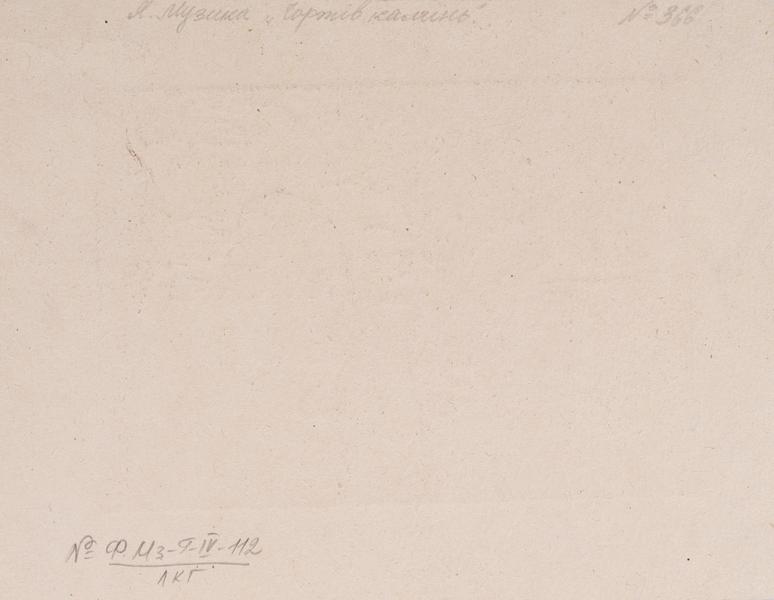 At the right below the print is an inscription in pencil: "Muzyka Yar.", on the left is the author's inscription: "Devil's Stone". On the reverse side along the upper edge is written in pencil: "Y. Muzyka ‘Devil's Stone’ No. 366".