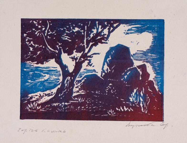 The image depicts a colour print in the centre of the sheet. A tree with its crown resting against the sky is shown in the foreground at the left. Rocky stones are reproduced at the right, a little further into the depths of the picture. White clouds can be seen behind them. The print is performed in two colours: blue and brownish-purple.