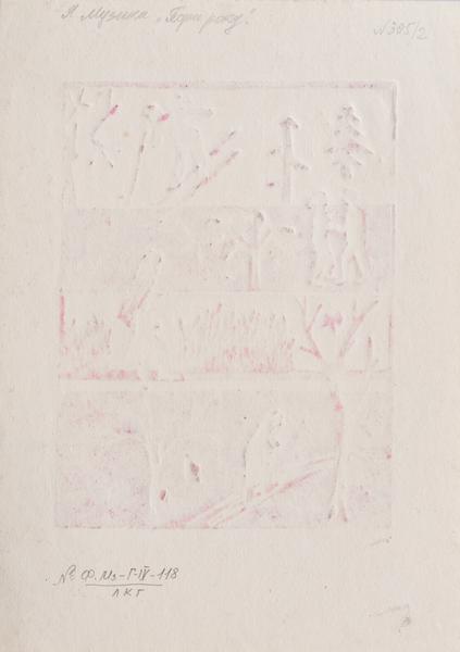The image depicts a print in the centre of the sheet, performed in black and ocher. The picture is divided into four horizontal stripes. In the upper one at the left, two fir trees are depicted on a white background; at the right is shown an ocher figure of a skier, and a tree fragment is visible to her right. Below, a man and a woman holding hands are depicted on a black background. In the centre is a stylised tree; at the right, there are flowers. In the third strip in the centre is a field with spikelets on an ocher background; at the right is a white figure of a woman with a sheaf in her hands. At the bottom left, on a black background, there is a tree from which leaves have fallen; next to it is a fragment of the road and a woman walking along it. At the right is a white tree from which leaves are falling.