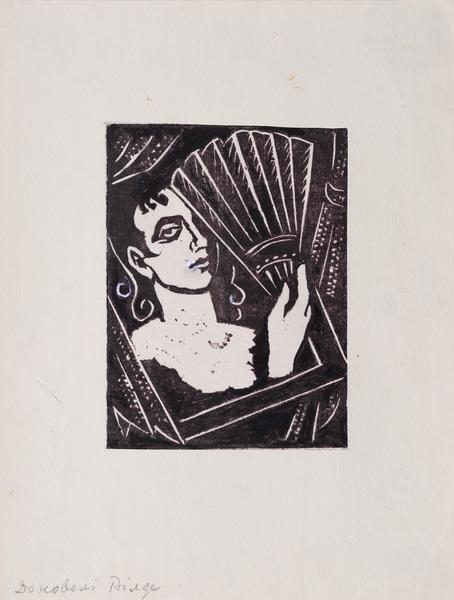 The image depicts a black-and-white print in the centre of the sheet. It portrays a stylised image of a woman's head in a diagonal frame and a fragment of her right hand holding a fan and going beyond the frame. Folds of drapery are outlined around the frame.