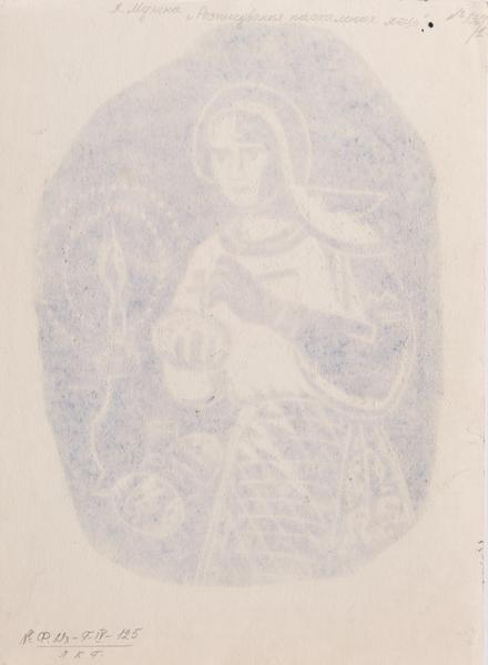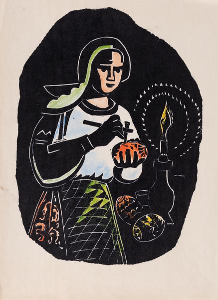 The image depicts a black-and-white irregularly shaped print in the centre of the sheet. It is tinted with watercolours of blue, ocher, and green tones. It portrays a woman wearing a headscarf and a folk costume at the left; she holds a pysachok (a special tool in the form of a stylus for painting eggs) and a partially painted egg in her hands. A candle is burning on the right side of the table, and there are two Easter eggs on the table near the candlestick.