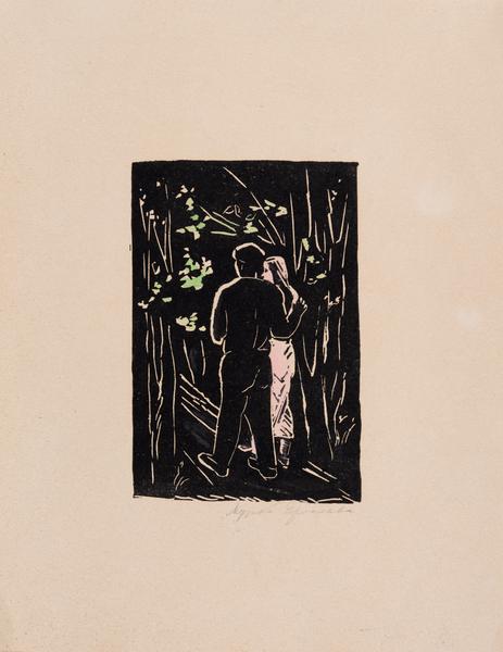 The image depicts a black-and-white print in the centre of the sheet. It is tinted with watercolours of green and pink tones. It portrays a dark figure of a man from the back and a figure of a woman tinted pink. The woman's face is depicted in profile. Two embracing figures walk down the road. On either side of the people are trees marked with a white outline; their leaves are tinted green.