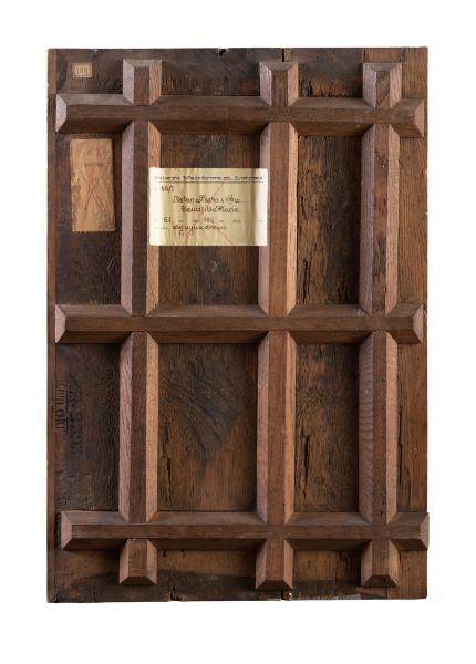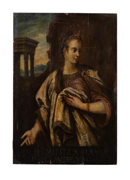 Against the backdrop of a decorative landscape with mountains on the right and triumphal gates on the left, there is a half-length portrait of a woman with her torso turned towards the viewer. Her head is turned three-quarters to the right, and her gaze is directed straight ahead. The woman's hair is adorned with two strands of pearls. The woman's right arm is extended to the side, while her left hand is pressed against her chest, lifting the edge of a white mantle. The woman's light purple garment is decorated with gold and pearls. Flavia Domitilla the Elder (? – before 69 AD) was the first wife of the Roman Emperor Vespasian. They married in the year 38. Flavia Domitilla the Elder was the mother of Flavia Domitilla the Younger and two Roman Emperors, Titus and Domitian. However, she passed away without seeing her husband or sons as Roman Emperors. Little is known about the daughter of Emperor Vespasian and Flavia Domitilla the Elder, Flavia Domitilla the Younger (45 AD – 66 AD). She was a matron during the early years of the Roman Empire. In 60 AD, she married Quintus Cerialis, with whom she had a daughter, but she passed away shortly after in 66 AD. In 85 AD, her brother, the Emperor Domitian, posthumously bestowed upon her the title of Augusta. In Ferentium, a temple was built in her honour.