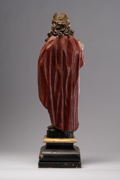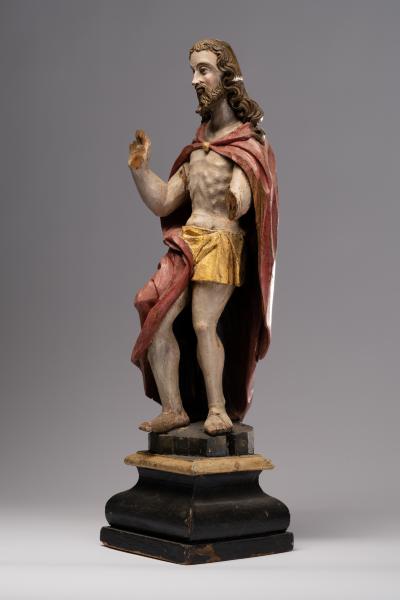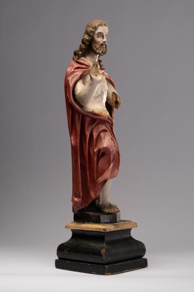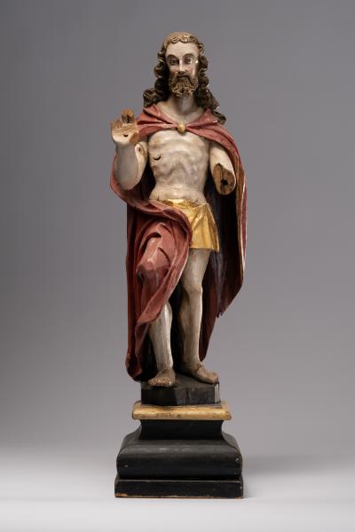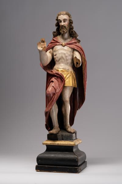 The single-figure sculpture of Christ's Ascension was placed on the tetrapod in springtime, where it remained for forty days until Easter. This sculpture is a volumetric, full-length image of Jesus with his hand in a gesture of blessing. The saint's figure follows Western iconography, which became popular in the territory of Ukraine in the 16th century. The body of Jesus, meticulously anatomically crafted, attests to the artist's skill. Slightly inclined towards the right shoulder, the head is framed by long strands of carved wavy hair cascading onto the shoulders. The gentle expression of the benign face is full of humility. Christ is dressed in a long red robe fastened at the chest, loosely draping down, covering his right leg. The preserved polychrome enhances the plastic perception of the work and the expressiveness of Christ's image.