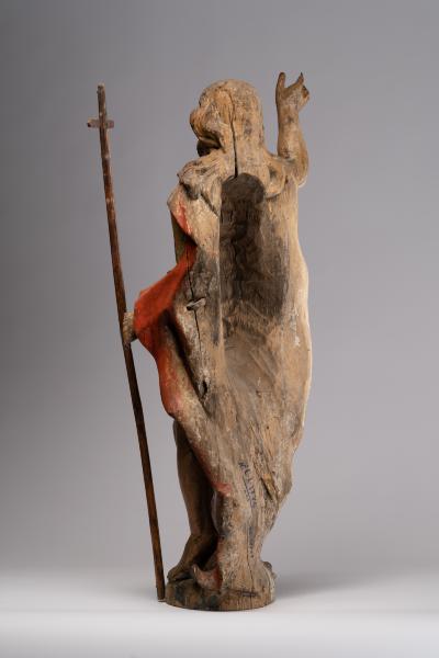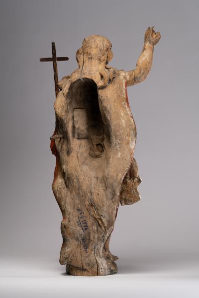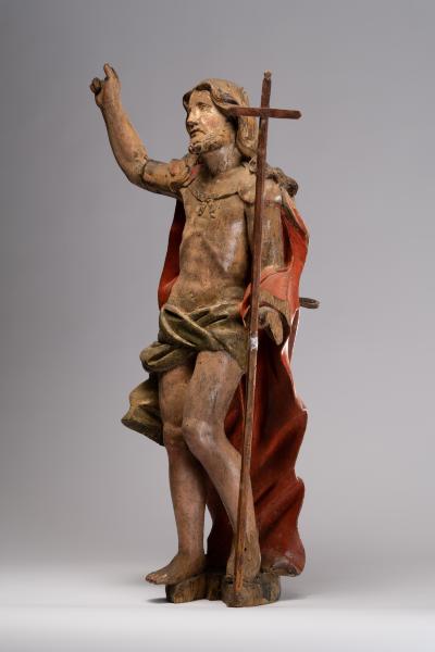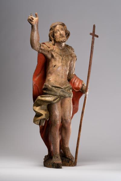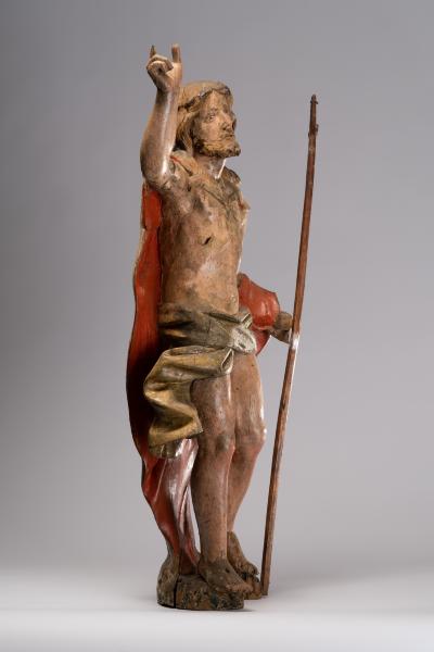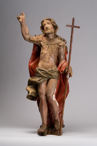 The sculpture of Christ's Ascension is a volumetric image of Jesus with a flag in his left hand. Such single-figure sculptures were placed on the tetrapod in springtime, where it remained for forty days until Easter. The saint's full-length figure follows Western iconography, which became popular in Ukraine in the 16th century. Jesus is dressed in a long red robe that cascades downwards as if fluttering in the wind. His bare, meticulously anatomically crafted body is enveloped by a loincloth sculpted with diagonal lines of low relief folds. The head, slightly tilted to the right shoulder, is framed by waves of sculpted hair cascading onto the shoulders. The gentle expression of Christ's benevolent face is filled with humility. The author emulated professional models, where the dynamics of movement are conveyed through the drapery of the robe and the forward-thrusting leg, representing the act of walking. The preserved polychromy enhances the plastic perception of the sculpture and the expressiveness of Jesus' image.