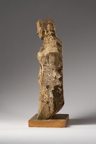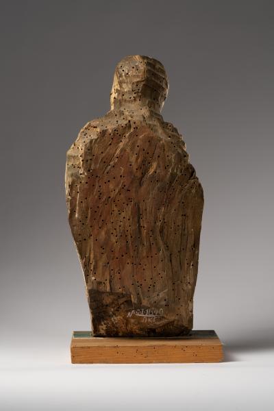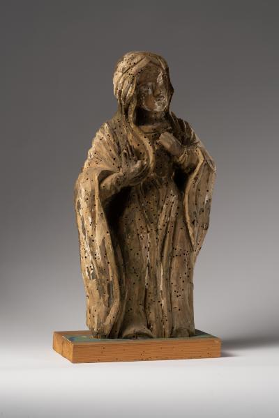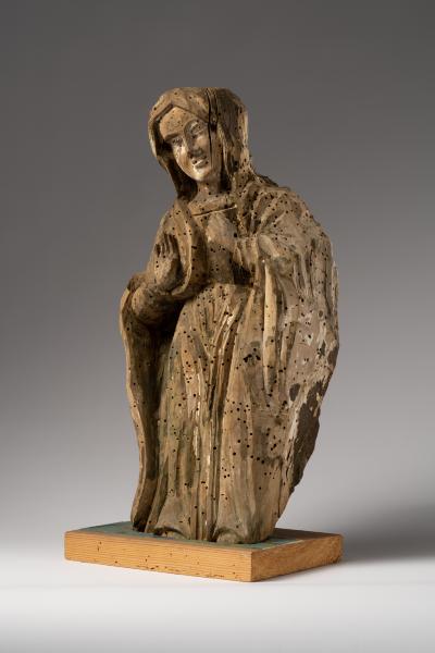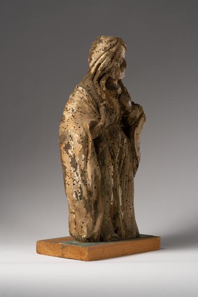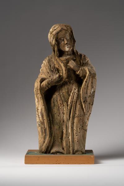 The Virgin Mary is executed in the same manner as the sculpture of Saint John with the inventory number C-I-1839. The small-sized static full-length figure of Mary was a part of a composition. The sculpture was carved from a single piece of wood. Delicately modelled, the maphorion covers the saint's head, wraps around her shoulders, and drapes down the back. The long tunic is covered with vertical draperies, the linear interpretation of which is characterised by slow movements. The mournful and humble face of Mary worked out in soft lines and her hands held to her chest express the pain of irreparable loss. Performed in a simple manner, typical of folk artists, the sculpture conveys a sense of humility and acceptance of the inevitable events that befell the Virgin Mary.
