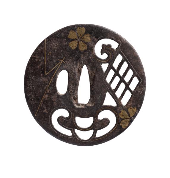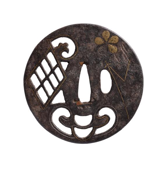 A round-shaped tsuba (maru-gata) with a wedge-shaped hole (nakago-ana) in the centre and a hole (hitsu-ana) for kozuka to the left of it. On the front side left of the centre, hole is a vertical inscription consisting of two characters. The surface of the tsuba is smooth with a carved image to the right of the central hole which consists of three elements: a figure in the form of a twisted horn, a diamond-shaped figure in the form of a grid and an abstract figure with symmetrically placed segments. Both sides of the tsuba are decorated with images of cherry and plum blossoms with applied petals and chaotic vertical strokes.