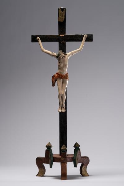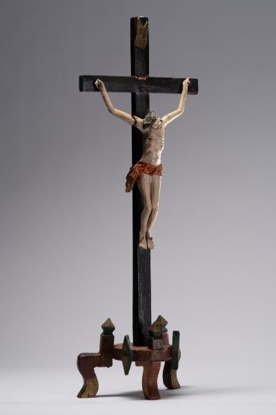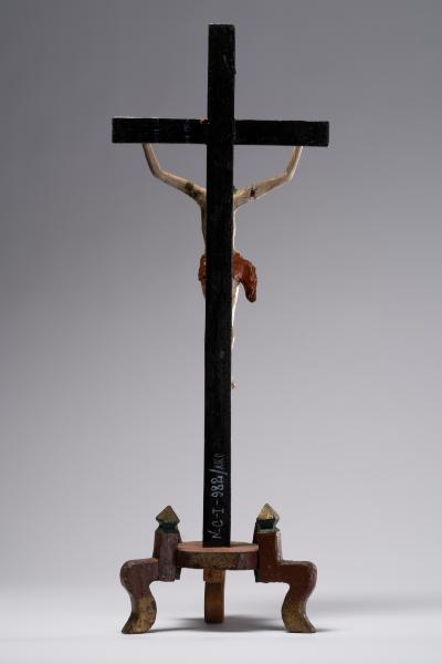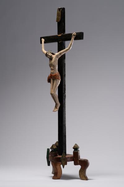 The compositional centre of the altar cross is the Crucifixion, a common subject among professional and folk artists. The crucifix from the Ivanivtsi village was made following the Byzantine tradition. Jesus is nailed to the cross with four nails, his legs are positioned parallel, and his palms are open. The artist depicted the Saviour as deceased with his eyes closed and head tilted to the right. The author's desire for anatomical accuracy is evident in the meticulously detailed face of the saint, his chest, arms, and legs. The crown of thorns is depicted as two intertwined rolls with protruding spikes. The loincloth fastened with a large knot adds decorativeness to the composition. The sculptural image is imbued with naive realism. Using the limited means characteristic of folk art, the sculptor conveyed the unspeakable agonies of Christ.