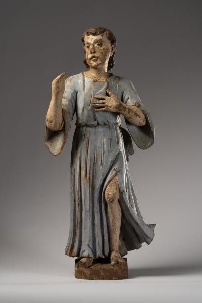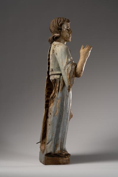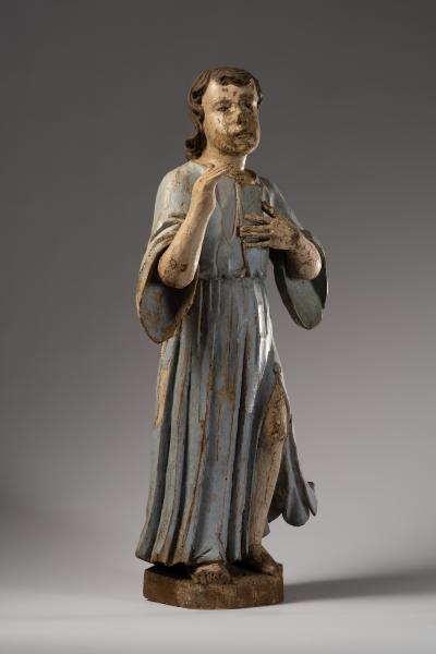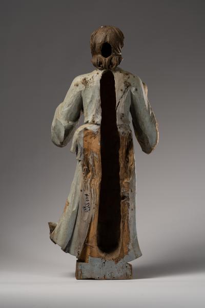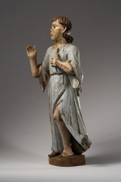The full-length contrapposto sculpture depicts an angel in the image of a young man. The squat, disproportionate figure indicates the authorship of a folk artist who attempts to depict the human body anatomically accurately. The author's primary focus is on the angel's concentrated face. In his visage, one can discern realistic human features: a large open forehead, deep small eyes, a long, broad nose, and full pursed lips. The elongated oval face bears a focused gaze. The angel's short black hair tightly frames the head. His body is covered by a long blue belted tunic, modelled with straight parallel vertical creases with rounded ribbed protrusions. The plastic line of the sculpture's contour and the soft outlines of the garment folds are consistent with the restrained and balanced image of the angel, carved in the characteristic naive and amiable manner of folk masters.