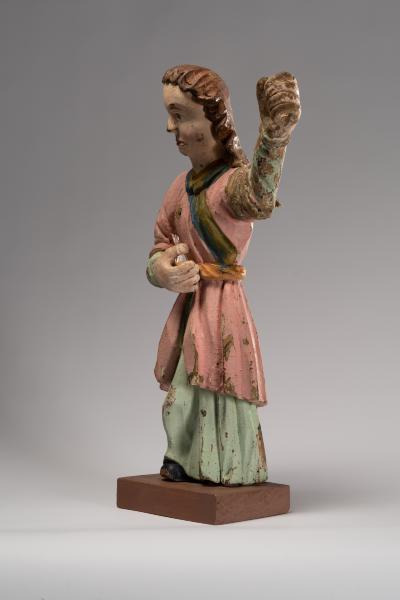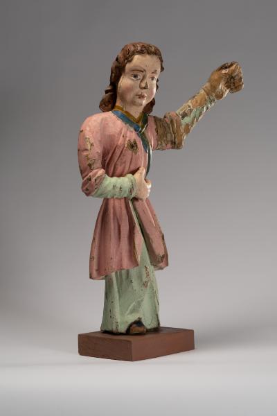 The frontal sculptural depiction shows a candelabrum in the form of an angel, depicted as a full-length figure of a girl. There is a space for a candle in her raised left hand. In his work, the artist focused not on preserving anatomically correct forms but on achieving expressive imagery of the sculpture through simplified plane modelling of the form. Realistic features can be observed in the angel's face: a high, open forehead, small, deeply set eyes, chubby cheeks, a snub nose, and neat pursed lips. The sculptural depiction is static; the calm and balance of the figure are not disturbed by the slightly extended right leg; the folds of the clothing are barely discernible and fall in smooth, parallel vertical lines. The angel's portrayal is characterised by a succinct interpretation of the image, emphasising individual details.
