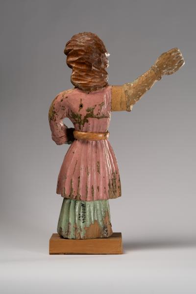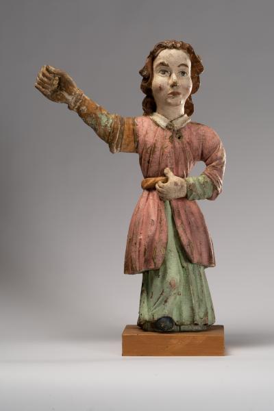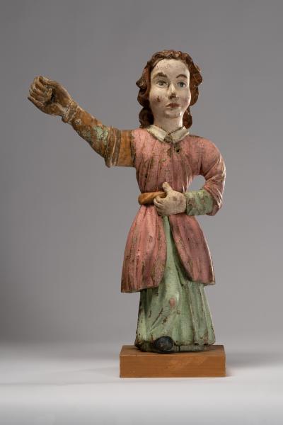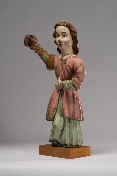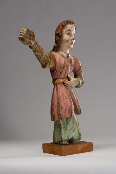 The sculptural image demonstrates a candelabrum in the form of a squat, full-length figure of a young girl as an angel. She is depicted with her right hand outstretched to the side, in which a candle was placed. In his work, the master does not focus on preserving anatomically correct forms but rather on achieving the sculpture's figurative expressiveness through simplified plane modelling of the form. To portray the angel's face, the author adapted features from his surroundings: a high, open forehead, small, deep-set eyes, chubby cheeks, a snub nose, and a delicate mouth. The sculptural image is frontal and static. The angel's calmness and balance are not disrupted even by the barely discernible folds of the clothing, which envelop the figure in smooth, parallel vertical lines. The portrayal is characterised by a succinct interpretation of the image with emphasis on individual details.