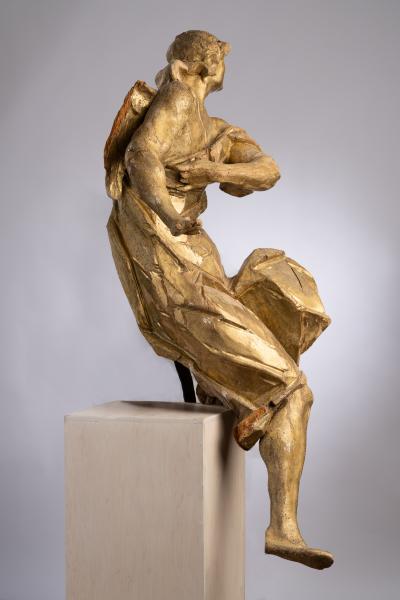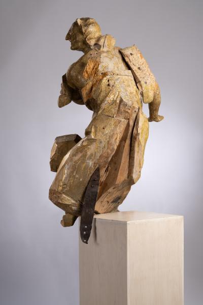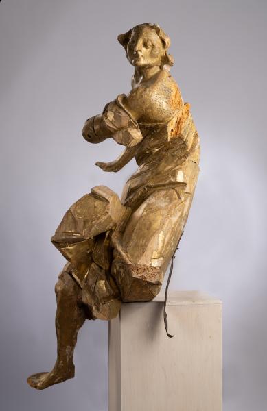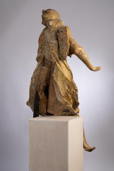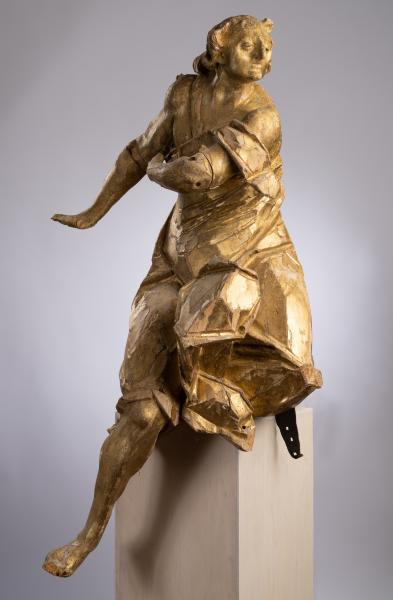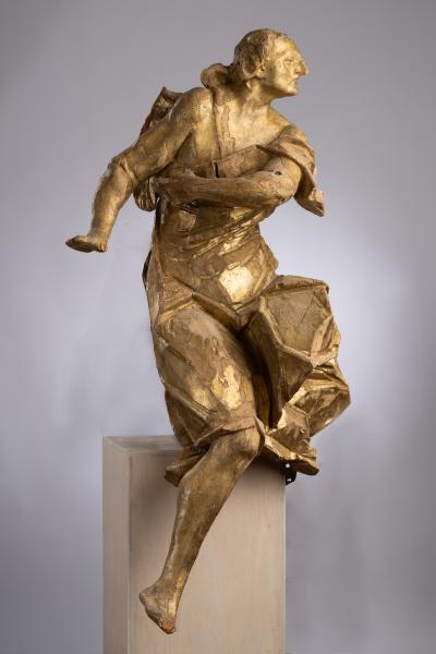 The full-length figure of an angel is shown as a young man in a dynamic Baroque pose. His head is turned to the left shoulder; his arms are shifted to the left. The angel's athletic body is depicted anatomically correctly. It is covered with a tunic that falls from his shoulders, exposing the upper part of the figure. It was important for the sculptor to convey the shape, mood, and expressiveness of the image inherent in Baroque plastics. The oval face with a protruding beard is clearly defined. The figure has a high forehead, which passes into a long nose in a straight line, voluminous cheekbones, almond-shaped eyes with clearly defined eyeballs and massive eyelid arches. The angel's clothing is modelled by abstract planes curved at different angles with geometric sharply cut folds. The sculpture impresses with its graceful pose and unique silhouette.