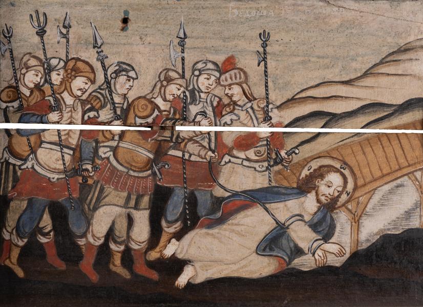 One of the images depicts the episode of Christ's arrest. The event occurs in the Garden of Gethsemane: the guards tie Jesus up and take him to the court of the chief priests. The author used a precise, expressive contour, depicting a group of guards dressed as Roman soldiers against the background of a mountainous landscape. The scene is characterised by compositional harmony and colouristic balance.