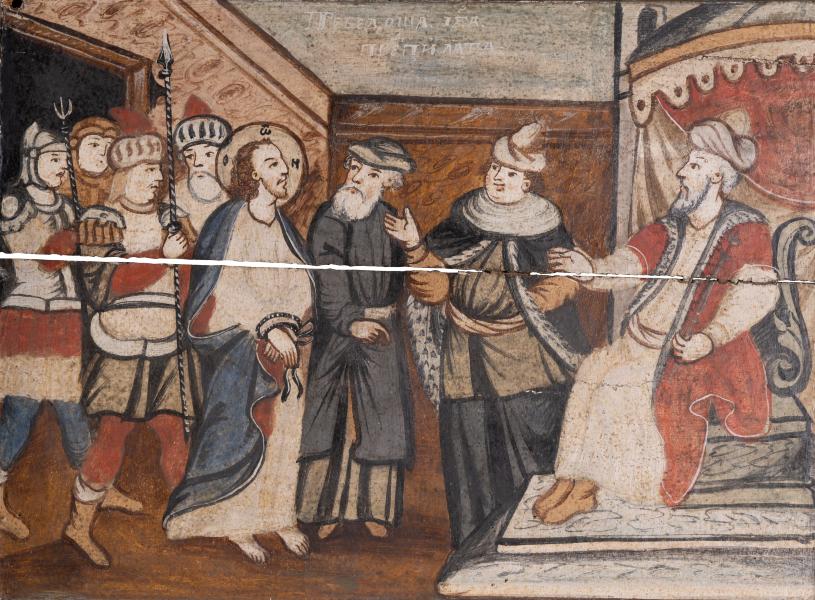 The other three images are related to the last trial of the Saviour, which was conducted by the Roman governor of Judea, Pontius Pilate. The artist depicted a scene when the Jewish chief priests and guards brought the bound Saviour to Pilate's court to have him sentenced to death. The main character in the story is Christ, who is the focus of everyone's attention. The squat figures with a clear graphic contour line are depicted flatly and in warm colours. After taking water and washing his hands, Pilate declared in front of everyone: "I am innocent of this Man's blood; see to that yourselves..." (Matthew 27:24). It was this scene that the icon painter conveyed, depicting a significant number of everyday details. "Ecce Homo" is a well-known scene in Western European art that visualises the suffering of the Messiah, highlighted in the work from the village of Semenivka. Christ is depicted wearing a crown of thorns, bloody after being scourged, with a red cloak on His shoulders. Despite the abuse, the frontal image of the Saviour remains solemn and balanced, unlike his executioners, depicted in profile, which in the language of symbols of ancient iconography was a sign of contempt. A dark graphic contour characterises the work; the eyes of the characters are expressive, with an emphasis on the pupils, and active blushes are visible on the bleached faces. The scenes of the Passion of Christ attract attention with their simplicity, immediacy, expressiveness of the drawing, and detailed reproduction of everyday things.