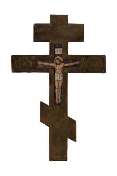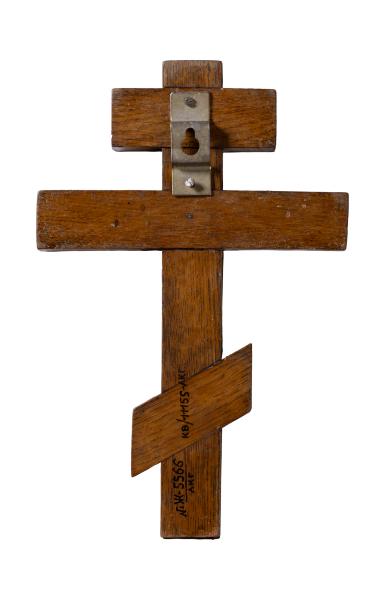 The cross is one of the most important symbols and amulets in the life of Christians. The most common type of cross is the hand cross. It is an eight-pointed cross with an elongated central and sloping lower crosspiece. The composition is simple and laconic. On the front, on a slit Greek cross, there is a picturesque crucifixion, where the artist has used a traditional compositional solution. The image occupies the central frame and part of the central bar. It is executed by imitating Byzantine iconography, where the Saviour is nailed to the cross with four nails. His legs are parallel, his arms are outstretched, his head is inclined towards his right shoulder, and his palms are open. The artist is conveying the anatomical features of the human body. Above Christ's head is a plaque with the letters "INRI". On the upper frame is an inscription: "Jesus of Nazareth, King of the Jews". Below the crucifixion is the inscription: "NIKA", and at the lower end of the central staff, there is a graphic representation of a six-winged seraph and the inscription: "Ferdinand Schie in Lviv".